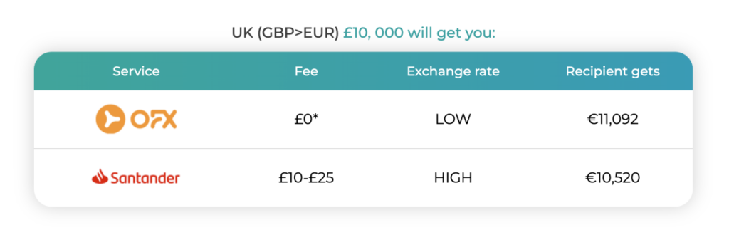 Alternatively, one can use a transfer service, such as OFX. Account opening is free and online so Werner won’t have to leave his house: after registration and an online quick authorization, his account will be up and running in no time, with his current Santander bank account connected. OFX offers a way better deal with $0 transaction fee and a fair mid-market GBP-EUR exchange rate of 1.09. Within 24 to 48 hours on average, and same $10,000 sent by Werner, his friend in Brussels will receive approximately €10,905, which is almost €400 more than via a bank.