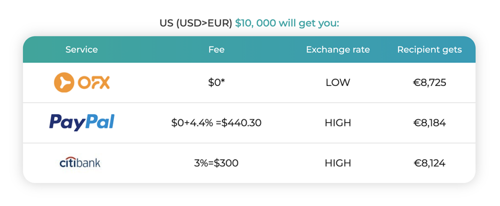 *Charges may occasionally be applied by a third party bank when transferring the funds to OFX or before the funds arrive in the recipient account.